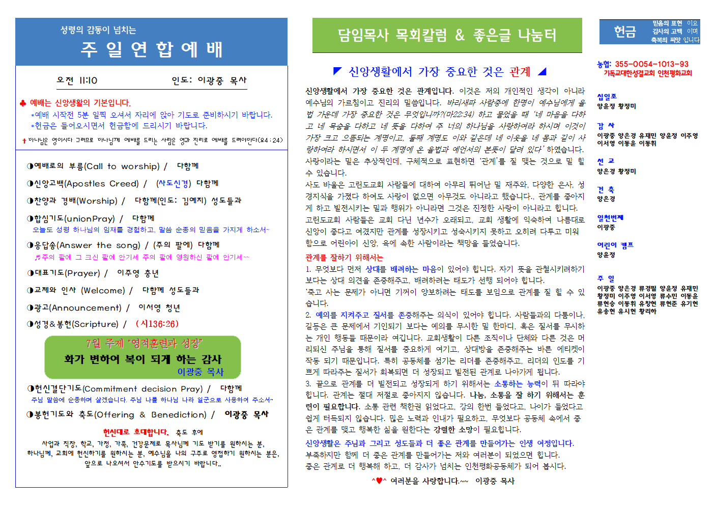 인천평화교회 제24-30 / 2024년 7월 28일 주보