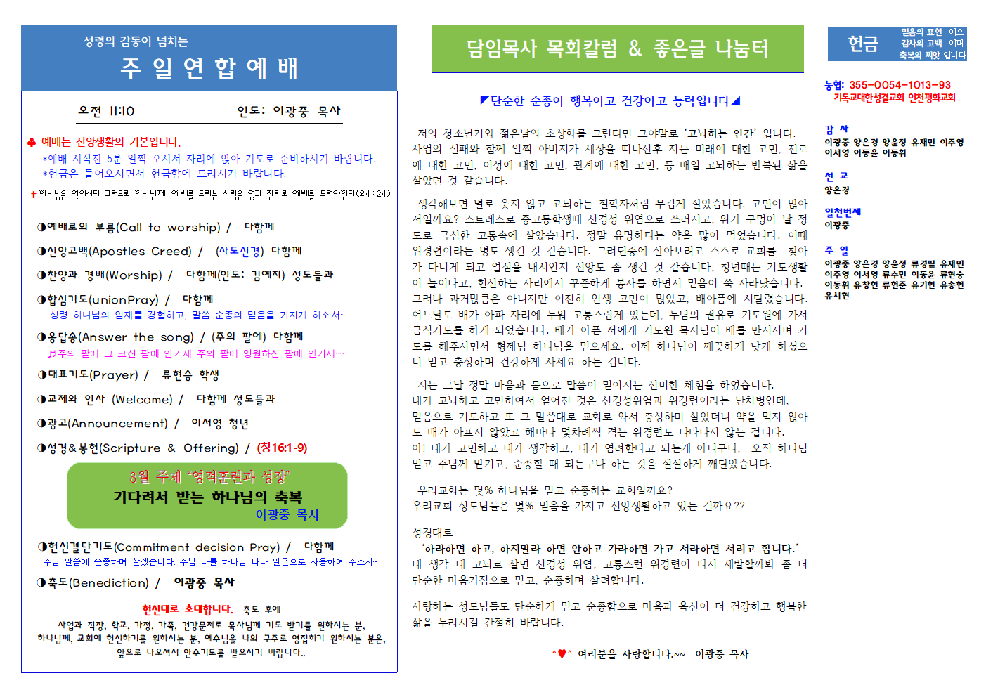 인천평화교회 제23-35 / 2023년 8월 27일 주보