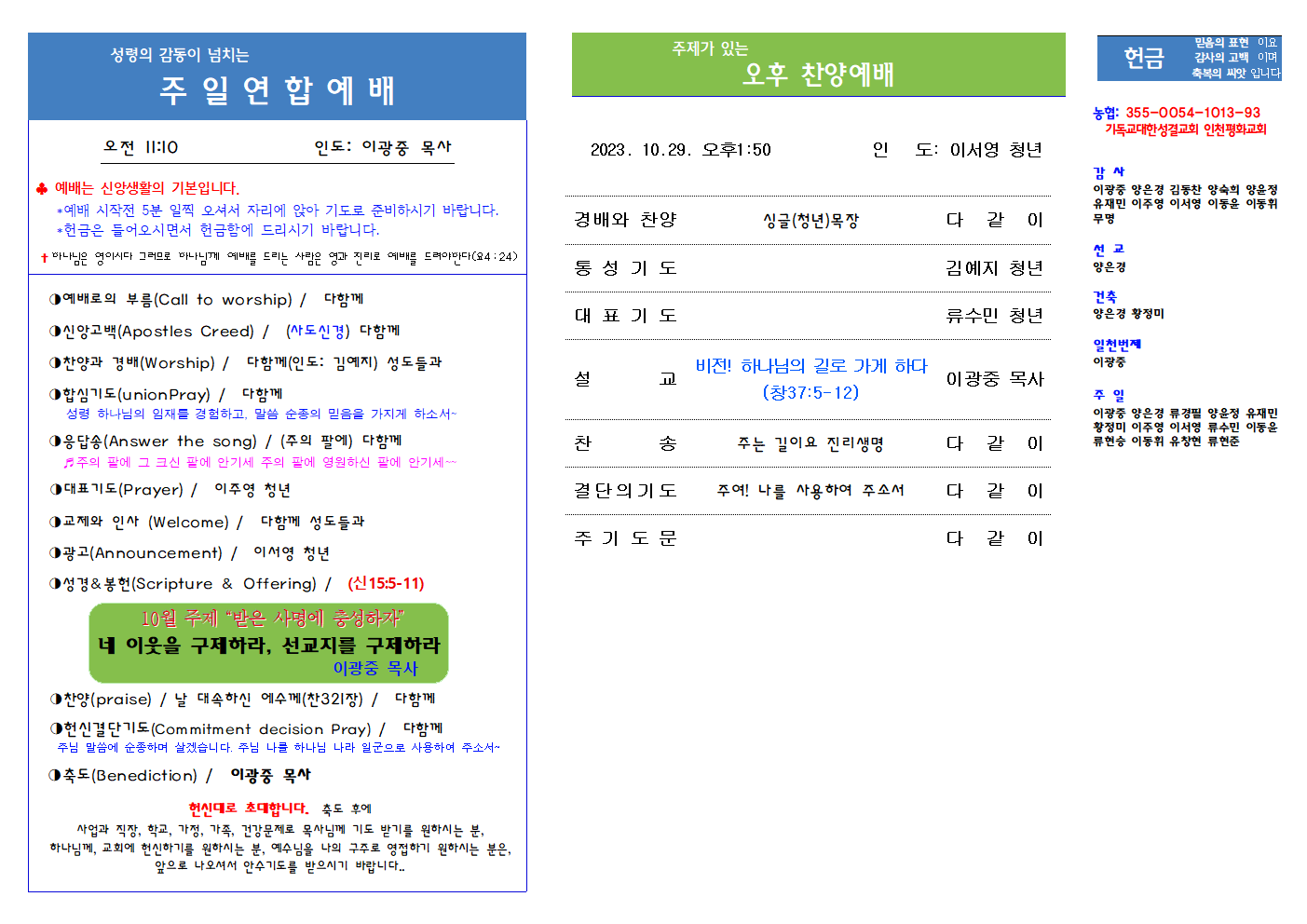 인천평화교회 제23-44 / 2023년 10월 29일 주보