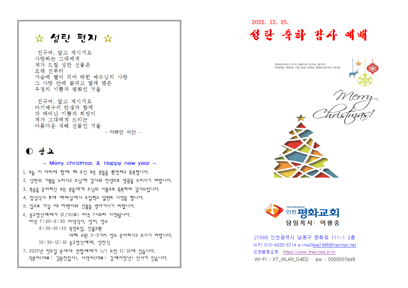 인천평화교회 제22-52 / 2022년 12월 25일 주보 페이지 정보 작성자 인천평화교회 댓글 0건 조회 671회 작성일 22-12-24 18:48 본문 인천평화교회에 오셔서 예배드리시는 여러분을 환영하고 축복합니다.서로인사합니다 ~ 행복하세요! 잘됩니다! 하늘복 받으세요! 제 목 / 12월 주제 “성탄을 기다리며 준비하자” 예수님이 오신 이유 (이광중 목사) 첨부파일 2022성탄주보.hwp (1.1M) 목록 이전글인천평화교회 제23-01 / 2023년 1월 1일 주보 22.12.31 다음글인천평화교회 제22-51 / 2022년 12월 18일 주보 22.12.17 댓글목록 댓글목록