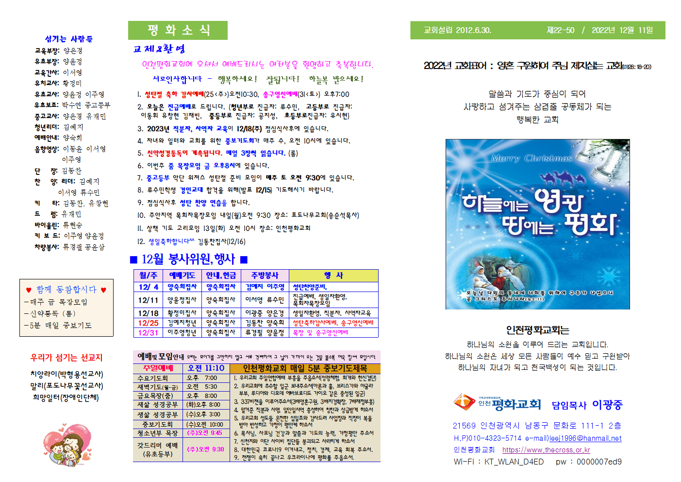 인천평화교회 제22-50 / 2022년 12월 11일 주보