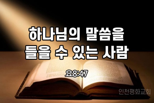 하나님의 말씀을 들을 수 있는 사람(요8:47)하나님은 영으로 존재하십니다.보이지 않습니다.보이지 않는 하나님을 이해하고 주님의 일하심을 어떻게 경험할 수 있을까요?하나님을 이해하고, 경험하는데 있어서 가장 확실하고 분명한 길은,하나님이 하시는 말씀을 듣는 것입니다. (요1:1) 말씀은 곧 하나님이시니라말씀을 들을 때 우리는 살아 계신 하나님을 만날 수 있고, 말씀을 통해서 우리를 위해 일하시는 하나님의 능력을 경험할 수 있습니다. 그러면 우리가 하나님의 말씀인지, 아닌지를 어떻게 할 수 있습니까?그리고 하나님의 ...