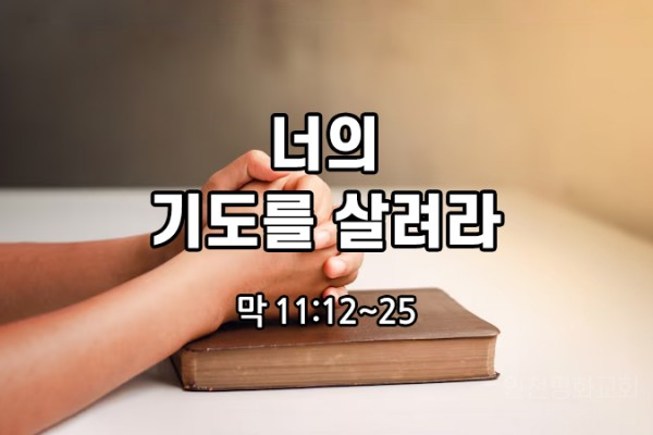 너의 기도를 살려라(마가복음 11:12~25)교회가 놀라운 부흥을 이루는 길,성도가 메마르지 않고 시냇가에 심겨진 나무처럼 풍성한 열매를 맺는 삶을 살게 하는 것은 무엇일까에 대한 해답을 얻게 될 것입니다.오늘 본문에 나오는 이야기는 3가지입니다. 첫번째는예수님께서 예루살렘 베다니라는 마을로 가시는데 배가 고팠습니다.그래서 무화가 나무 열매를 잡수시려고 가까이 갔더니 잎사귀는 많은데 열매는 하나도 없는 겁니다. 예수님께서 열매 없는 무화가 나무를 저주하셨습니다.두번째는 예수님께서 성전에 가셨는데 성전 앞에...
