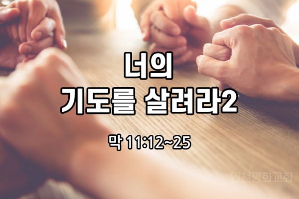 너의 기도를 살려라2 (마가복음 11:12~25)오늘 말씀엔 교회가 집중할 일이 나옵니다.성도가 열심을 내야 할 일이 나옵니다.첫 번째 일은 희생하는 일이고 오늘은 두번째우리교회, 저와 여러분이 할 일은 기도를 살려내는 일입니다성전은 하나님이 거하시는 집이요 처소이며,교회는 예수님을 나의 구주로 마음에 영접한 사람, 믿는 성도들의 모임, 신앙 공동체입니다.교회, 성전은 단순히 건물이 아닙니다.‘교회는 하나님의 집인데, 특히 기도하는 집이다’ 라고 예수님이 말씀하셨습니다.주님깨서 성전의 본질적인 기능, 교회와 성도가 우선 할 일을 알...