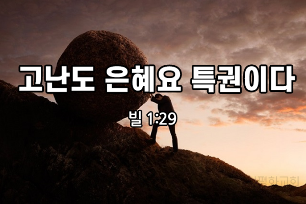 고난도 은혜요 특권이다(빌1:29)미국 풀러신학대학교 교수이자 목사인, 존 맥스웰은 인간 성장과 성숙의 법칙은 고통이라 했습니다.아픈 만큼 성장한다고 하는게 맞습니다.비온뒤에 땅이 굳어진다고 합니다.시련과 고난을 겪고나서 더 좋아지고 단단해집니다.성장과 성숙으로 가는 지름길은 단연 고난, 시련입니다.그러나, 알면서도 고난을 좋아하는 사람은 없습니다.예수님께서도 십자가 고난의 길을 걸어야 할 때,아버지 이 고난의 잔을 내게서 옮겨주시기를 원합니다.그러나 내 뜻대로 마옵시고 아버지의 뜻대로 되기를 원합니다. 라고 기도했습니다....