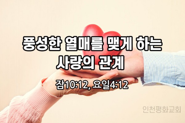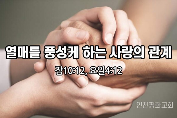 풍성한 열매를 맺게 하는 사랑의 관계 (잠10:12, 요일4:12)그리스 철학자 아리스토텔레스는 인간을 사회적인 동물이라 정의하였습니다.대단한 발견입니다.오늘 설교 말씀을 들을 때 내가 누군인지, 내가 할 일은 뭔 지 발견하는 은혜가 있기를 축원합니다.사람은 관계를 떠나서 살 수 없습니다. 사람은 관계 안에서 존재하며, 관계속에서 살아갑니다.그래서 그 어떤 것보다도 관계가 중요합니다.관계는 둘 이상 혹은 여럿이 얽혀 져 살아가는 삶을 말한다.하나님의 말씀인 성경에서 관계는 크게 위로는 하나님과 관계 그리고...