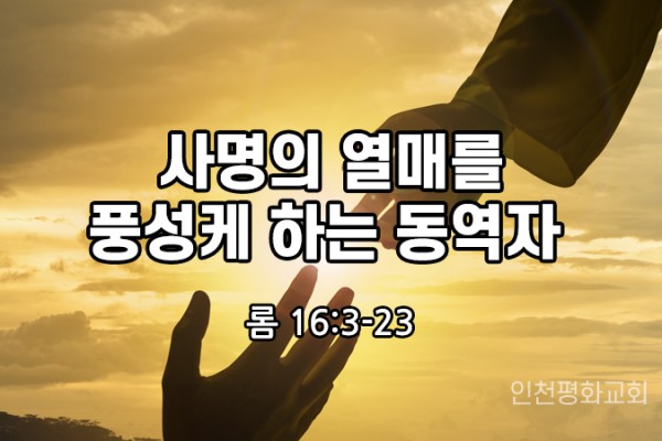 사명의 열매를 풍성케 하는 동역자 (롬16:3-23)바울이 기록한 13권의 성경을 반지라고 한다면 로마서 성경은 반지에 박힌 보석에 비유합니다.이렇게 중요한 로마서 성경의 마지막장인 16장에는 34명의 인물들의 이름이 기록되어 있습니다.기록된 사람들에겐 공통된 특징이 있습니다.첫째는 바울의 동역자입니다. 두 번째 공통된 특징? 복음전파하여 하나님 나라 확장을 위해 헌신한 사람들세 번째는 주님의 소원인 주님의 몸된 교회를 세우는 헌신자입니다.마16:16 예수님의 소원대로 이 땅에 교회가 세워졌습니다.그런데 ...