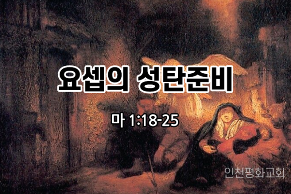 요셉의 성탄준비 (마1;18-25) 오늘 우리는 대림절 3주차를 맞이했습니다. 우리는 무엇을 준비하며 기다려야 할까요? 오늘은 마리아의 남편이 되고, 예수님의 육신의 아버지가 되는 요셉을 통해 축 성탄이 되도록 준비하고 기다리는 우리에게 주시는 하나님 음성을 듣는 복된 성도가 되시 길 축복합니다. 1. 은혜로 반응하라 입니다. 마리아와 결혼하기로 약속한 요셉은 마리아가 잉태한 것을 알았을 때 요셉은 어떤 반응을 보였는가?&n...