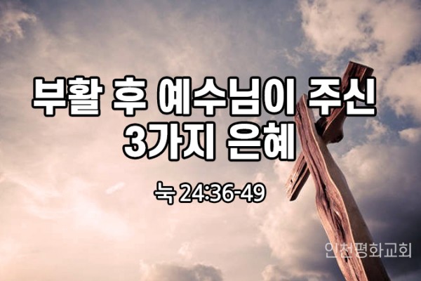 부활 후 예수님이 주신 3가지 은혜 (눅24:36-49)예수님께서 대속의 제물로 죽으시고 3일만에 죽음을 이기시고 부활하셨습니다.십자가와 부활은 우리 기독교의 핵심중에 핵심입니다.집으로 치면 집을 든든하게 세워주는 양 기둥이고, 나무로 말하면 뿌리와 같고, 새로 말하면 두 날개와 같습니다.오늘 설교말씀을 통해서 내 삶에 부활되어야 할 것들이 힘있게 살아나는 큰 은혜를 받을 수 있기를 바랍니다.1. 오늘 말씀의 첫 번째 키워드는 평화(평강)입니다.평화, 평강을 샬롬이라고 합니다.부활후에 예수님이 제자들을 만나주시는데...