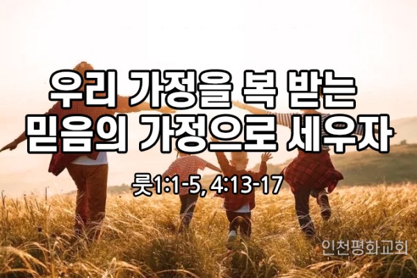 우리 가정을 복 받는 믿음의 가정으로 세우자 (룻1:1-5, 4:13-17)가정을 만드신 분은 하나님이십니다. 창1:27-8 하나님이 당신의 형상대로 4)사람을 창조하셨으니, 곧 하나님의 형상대로 사람을 창조하셨다. 하나님이 그들을 남자와 여자로 창조하셨다.하나님이 그들에게 복을 베푸셨다. 하나님이 그들에게 말씀하시기를 "생육하고 번성하여 땅에 충만하여라. 땅을 정복하여라. 바다의 고기와 공중의 새와 땅 위에서 살아 움직이는 모든 생물을 다스려라" 하셨다.창2:18 주 하나님이 말씀하셨다.&nb...