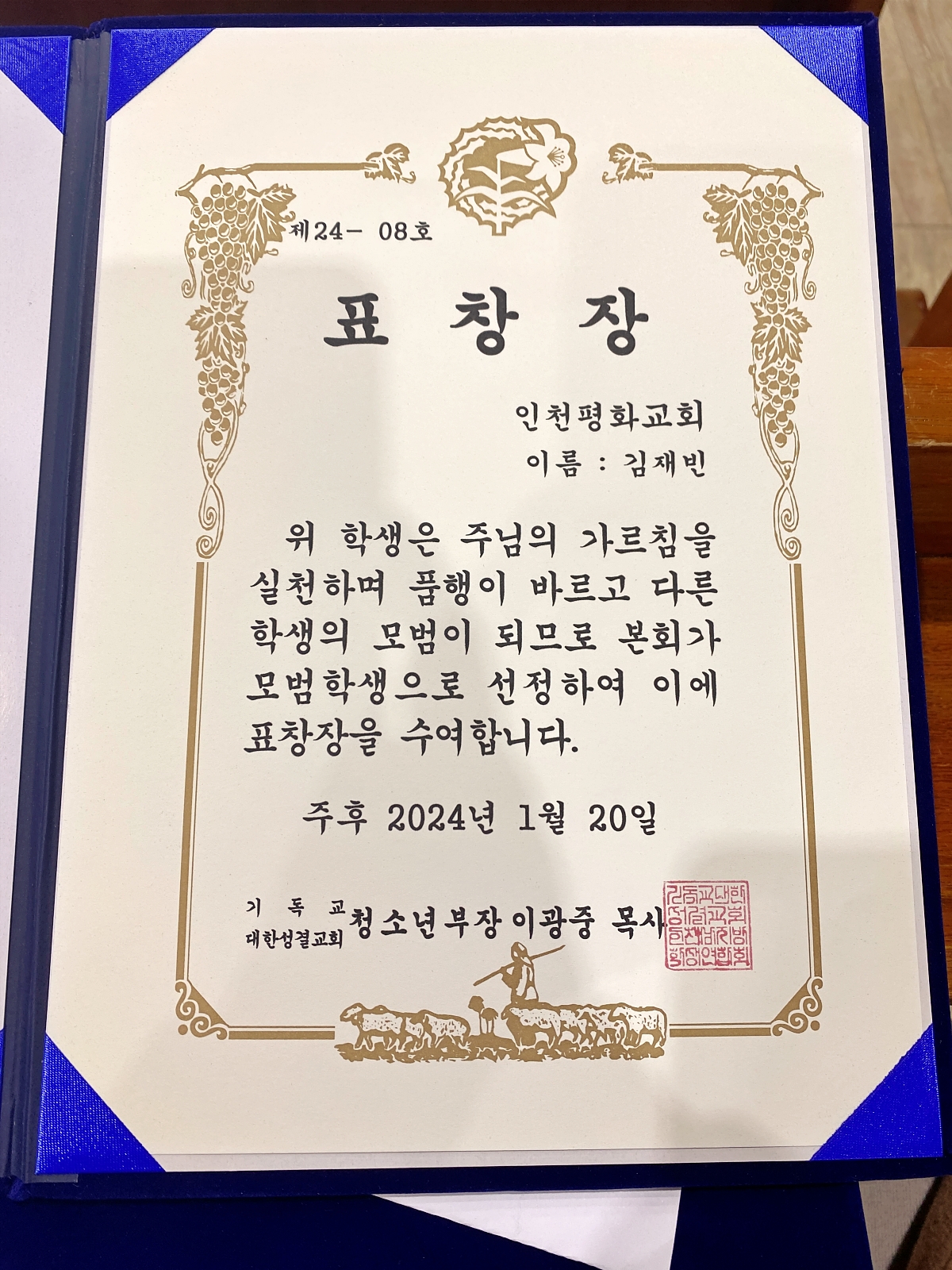 모범학생표창 - 김재빈학생 페이지 정보 작성자인천평화교회 댓글 0건 조회 177회 작성일 24-01-28 22:10 본문 목록 이전글중고등부 겨울방학 목장모임 - 포켓볼 24.01.28 다음글2024 인천평화교회 - 사역자, 직분자 선서식 24.01.14 댓글목록 댓글목록