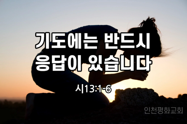 기도에는 반드시 응답이 있습니다 (시13:1-6)오늘 시편13편은 다윗의 기도문입니다.오늘 말씀을 통해 기도에 대하여 깨닫고, 확신을 갖는 시간이 되기를 바랍니다.하나님은 성도들의 기도를 들으시고 반드시 응답하신다입니다.기도가 살아나야 합니다.기도의 불이 꺼지거나, 식어지면 믿음은 약해지고, 마음이 낙심하여, 절망에 이르게 됩니다. 기도 응답은 3가지로 옵니다. 예스, 노, 웨이트1. 예스!!!모든 성도가 기뻐하는 응답입니다.너는 내게 구하라 그리하면 내가 주리라 하셨습니다.구하고 찾고 두드리라 그러면...