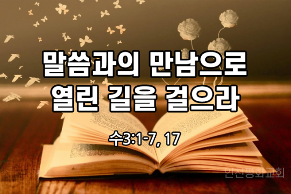 말씀과의 만남으로 열린 길을 걸으라 (수3:1-7, 17)오늘 본문 여호수아 3장에서 전쟁을 승리로 이끄는 승리의 비결, 가나안 정복을 위한 전략이 구체적으로 기록되어 있습니다.하나님이 이스라엘을 광야에서 가나안으로 이끌어 가시는 방법은 먼저 약속의 말씀을 선지자를 통해 전하여 기대와 꿈을 가지게 하시고그 다음에 받은 말씀을 하나하나 삶에 적용하게 함으로 가나안을 정복하게 하셨습니다.오늘 말씀을 듣는 여러분 마음에 기대와 꿈이 넘치고,금년한해 모든 영적 전쟁에서 승리를 이루는 성도가 되시기 바랍니다1. 하나님께 성...