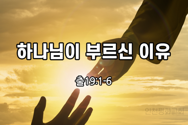 하나님이 부르신 이유 (출19:1-6)이스라엘이 이집트에서 탈출해 나온지 3개월 되는 날 시내산에 도착을 합니다.시내산에 도착하자 하나님께서 모세를 시내산으로 올라오라고 부르시고 모세는 시내산을 올라갑니다.하나님의 부르심에는 항상 목적, 이유가 있습니다.내 인생이 바른 길로 가기 원한다면, 나의 신앙생활, 나의 사명을 바르게 감당하기를 원한다면, 왜? 라는 의문 단어를 사용하여 하나님께 물어보아야 합니다.왜 나를 부르셨습니까?왜 내가 해야 됩니까?왜 이런 일이 일어난 겁니까?하나님께서 모세를 부르시고, 부르신 이유...