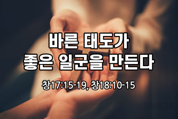 바른 태도가 좋은 일군을 만든다(창17:15-19, 창18:10-15)하나님께서 아브람이 75살때 부르시고 약속을 합니다.네게 아들을 주겠다.하늘의 별처럼, 바다의 모래알 같이 네 자손이 번성하게 될 것이다. 라는 약속을 했습니다.그런데 지금 99살입니다. 아브람은 무척 초조하고 불안했을 겁니다.75살때도 애를 못 낳았는데 괜히 믿었다가 허송세월 했나?하면서 스스로를 자책하며, 이 나이에 무슨 아들을 바라노... 쓸데없는 짓이지... 하면서 포기합니다.부인 사래도 남편 아브라함과 똑같이 60살 때 아들 약...