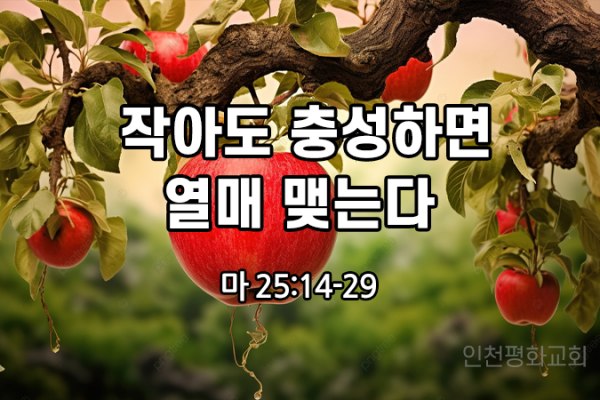 작아도 충성하면 열매 맺는다 (마25:14-29)오늘 본문은 달란트 비유입니다.오늘 본문을 통해서 우리가 깨닫고 실천할 것이 있습니다.1. 크기가 성공과 실패를 결정하지 못한다.하나님께서 종들의 능력에 따라 달란트 5, 2, 1를 주셨습니다.5,2,1 사람마다 차이가 있습니다.이 차이를 인정하고 수용하는 태도를 가져야 합니다.자기 자신을 보십시오... 우리 교회를 보십시오...1같을수 있고, 2같을수 있고, 5같을수 있습니다.우리교회는 크기로는 1입니다. 그것을 인정하십시요.지금 나에게 주어진 것이 5든,2든, 1이든, 무엇이든 그...