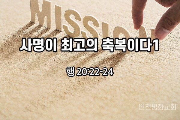 사명이 최고의 축복이다1 (행20:22-24)프랑스의 종교개혁자 요한 칼빈은 "인생이란 내게 주어진 사명의 길을 가는 것"이라 했습니다. 내가 하고 싶은 일, 내가 좋아하는 일, 내가 이루고자 하는일에 몸을 사리지 않고, 돈과 시간과 재능을 아낌없이 쏟아 부으며 사는 사람이 있습니다.그런가하면 하나님이 시키신 일, 곧 사명을 이루고자 돈과, 시간과 재능과 자기 목숨을 걸고 사는 사람이 있습니다.자기가 원하는 것을 이루고자 사는 사람의 삶은 사명자의 아닙니다.그가 비록 최선의 노력과 희생을 치르면서...