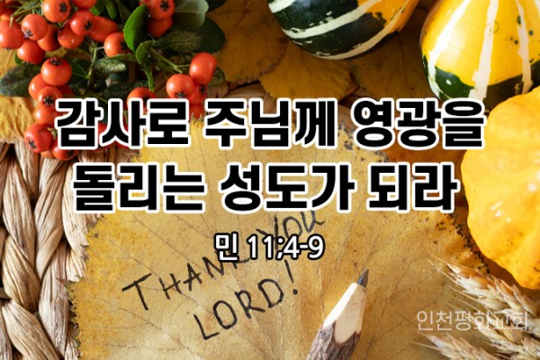 감사로 주님께 영광을 돌리는 성도가 되라.(민11;4-9)미국사람들이 일상생활에서 가장 많이 사용하는 말을 조사했는데 1위를 차지한 말은 ‘탱큐’ 감사합니다. 입니다.한국사람들이 가장 많이 사용하는 말은 빨리빨리입니다.감사합니다 라는 말은 사람의 마음을 기쁘게 해주고, 열리게 해줍니다.그런데 감사는 사람만이 아니라하나님도 기쁘게 해드리고, 하늘문을 열게 해주는 아주 탁월하고 뛰어난 최고의 언어입니다.설교의 대가라고 불리는 영국의 스펄젼 목사님은우리가 감사할 때 축복은 더 커지고, 축복의 기간은 연장되고, 불행은 끝이 난다고 했습니다...